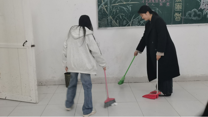交流研讨结束后,志愿服务活动有序开展。入党积极分子分工协作、默契配合。有的仔细擦拭桌椅门窗,有的认真清扫地面角落,有的着力清理杂物灰尘,大家不怕脏、不怕累,以实际行动践行服务精神,展现了良好的团队协作精神和高度的责任感,为校园环境的整洁贡献力量。