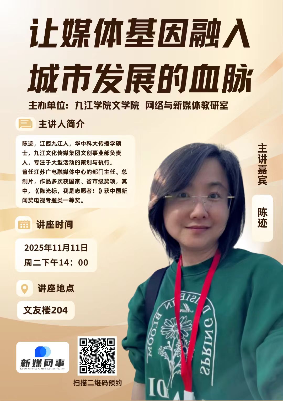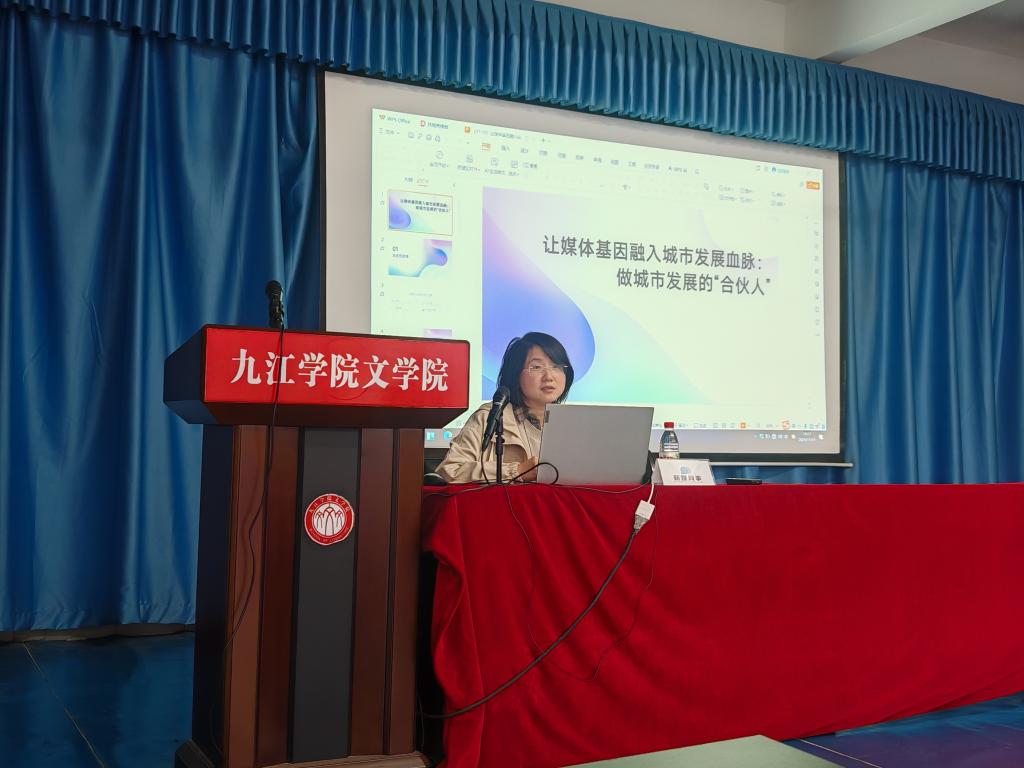 11月11日下午,九江学院文学院“新媒往事”讲坛在文友楼204教室举办,讲座特邀九江文化传媒集团文创事业部负责人陈迹担任主讲,以“让媒体基因融入城市发展血脉”为主题,通过理论解析与案例实践相结合的方式,为师生呈现了一场内容丰富的行业前沿分享。