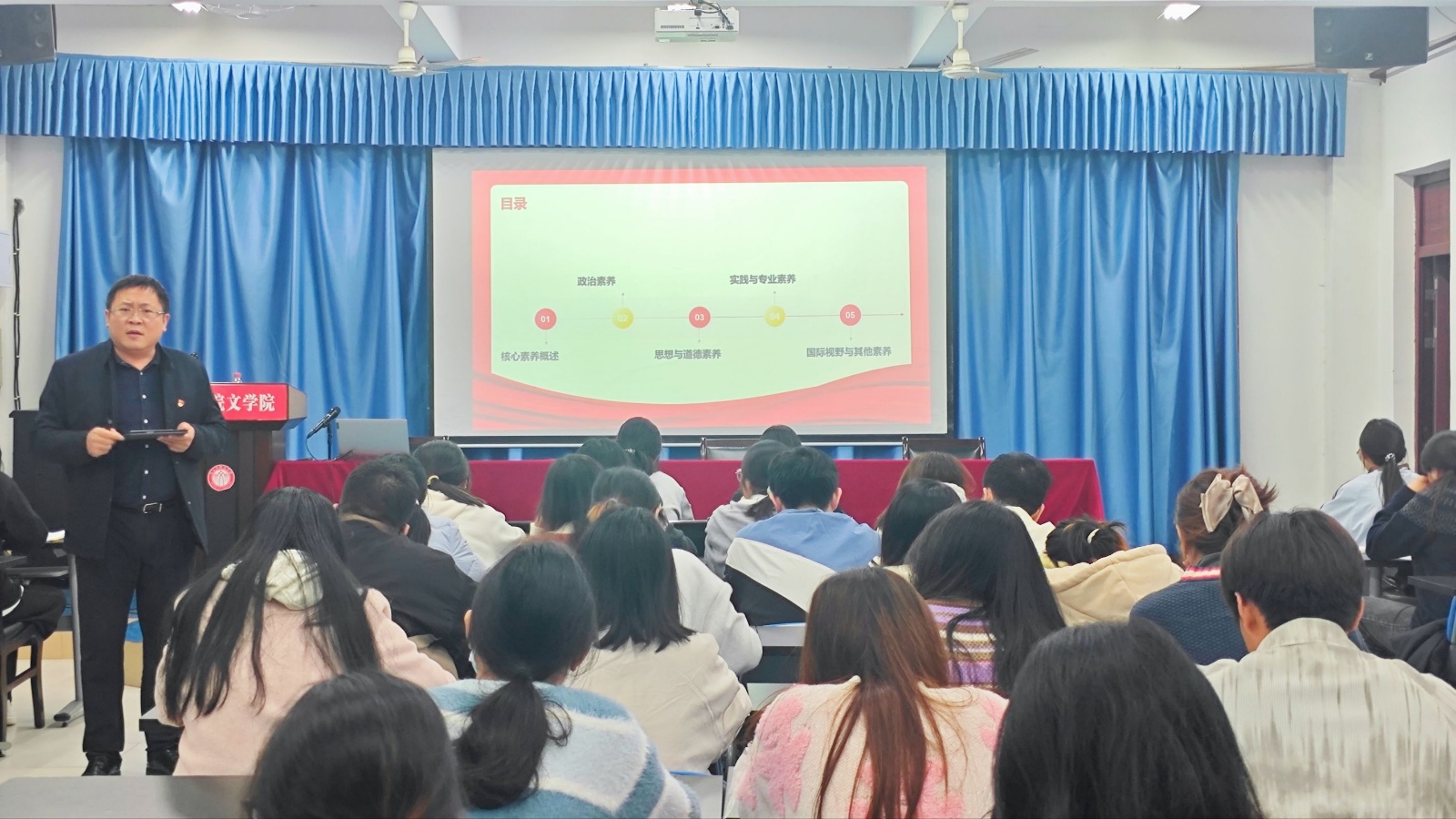 活动伊始,杨思迪老师围绕“新时代大学生的核心素养”展开论述,从“素养概述” 切入,清晰界定核心素养是新时代大学生成长成才的关键内核,是连接个人发展与国家需求的重要纽带。培养全面发展的核心素养,以适应时代发展需求,为成为合格的社会主义建设者和接班人筑牢基础。