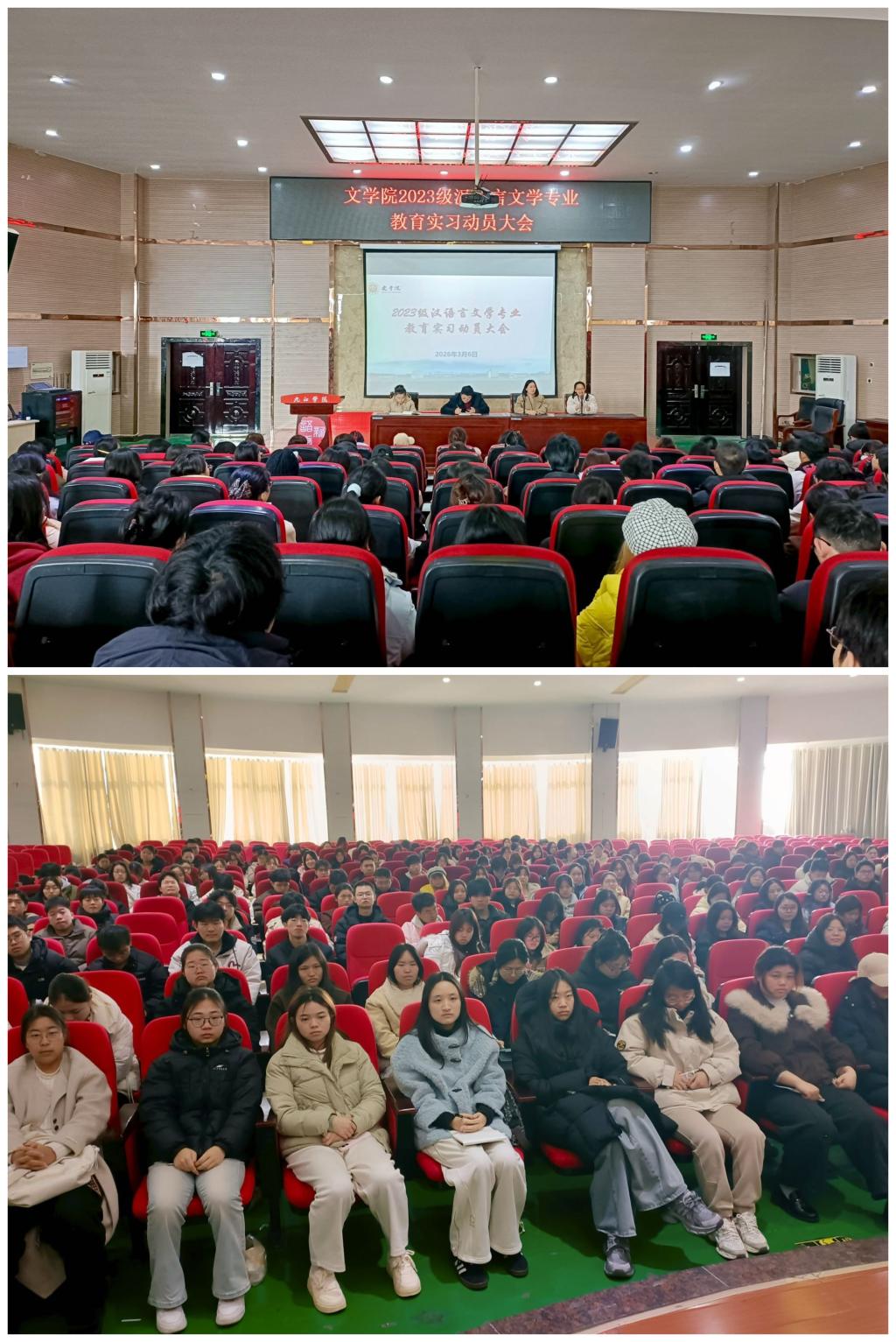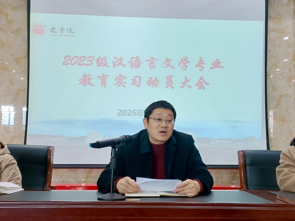 为扎实推进2026年春季师范生教育实习工作,确保实习安全有序进行,文学院于3月6日上午9:00在香远楼报告厅召开2026年春季师范生教育实习工作部署会。学院党委书记邓海波、副院长吴雯雯、教研科袁安安、2023级汉语言文学各班班主任、实习指导老师代表及全体实习生参加会议,会议由语文教育教研室主任鲍静怡老师主持。