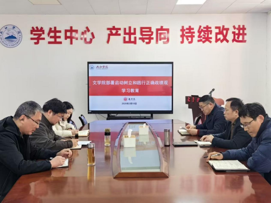 会议传达习近平总书记关于开展树立和践行正确政绩观学习教育的重要指示精神、中央党建工作领导小组会议精神、省委常委会研究部署全省树立和践行正确政绩观学习教育会议精神、省委学习教育工作专班会议精神和市委常委会会议精神,校党委书记李明斌在学校树立和践行正确政绩观学习教育动员部署会上的讲话精神,部署启动文学院树立和践行正确政绩观学习教育工作。