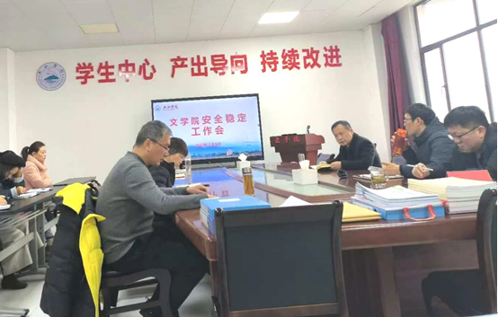为贯彻落实全省高校安全稳定工作视频会议及学校安全稳定工作会议精神,扎实做好期末及假期安全管理工作,12月30日,文学院在文友楼212室召开安全稳定工作会议。会议由院长李勤合主持,副院长程亚恒、党委副书记杨思迪、各科室负责人及全体行政人员参会,围绕形势分析、任务明确、责任压实,部署近期安全稳定重点工作。